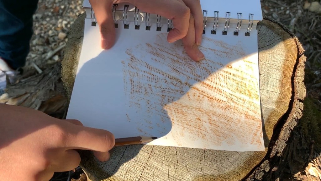 If you walk on the trail, you can see tree stumps like this among the many trees. You can draw a tree ring by placing a piece of paper on top of it and rubbing it with colored pencils.