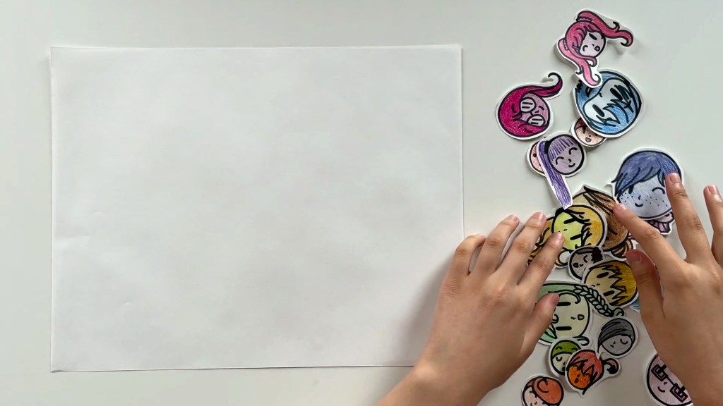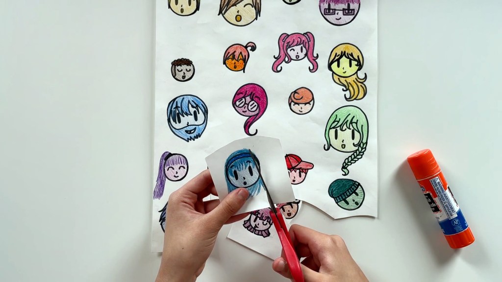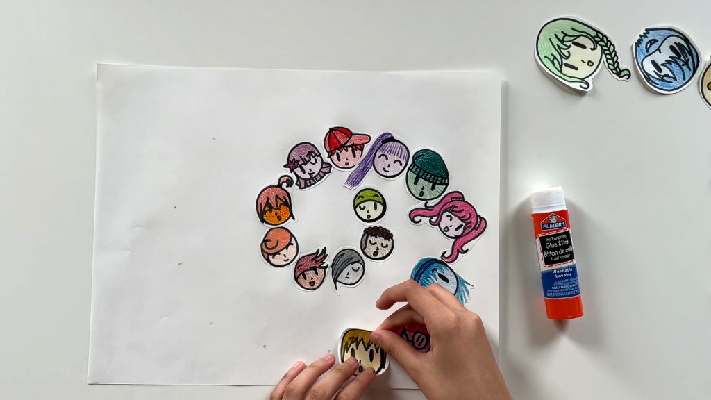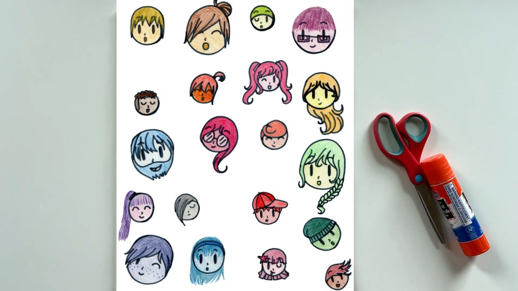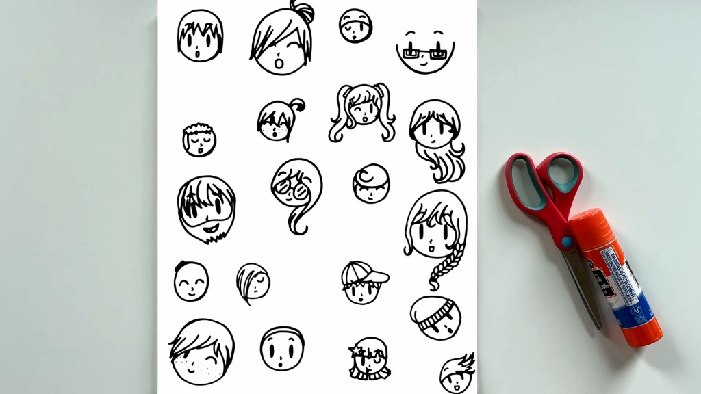 Now make a big shape with these faces. Take out another piece of paper and get ready to glue the cut-out faces on it.
