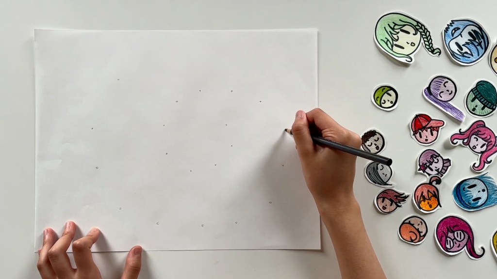 Think about the shape that you want to make with the cut-out faces and draw dots on the paper to mark the spots that the faces should go.