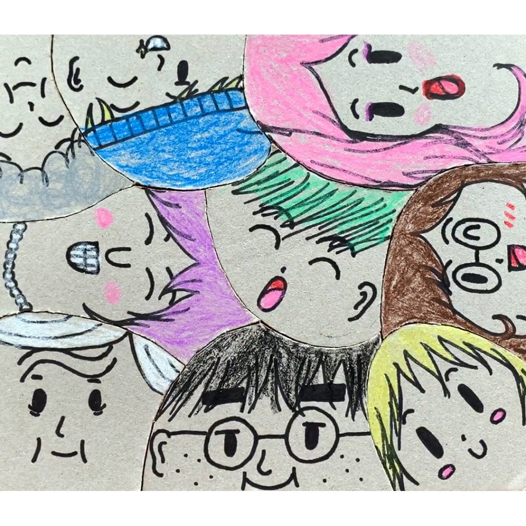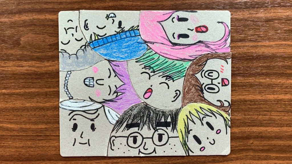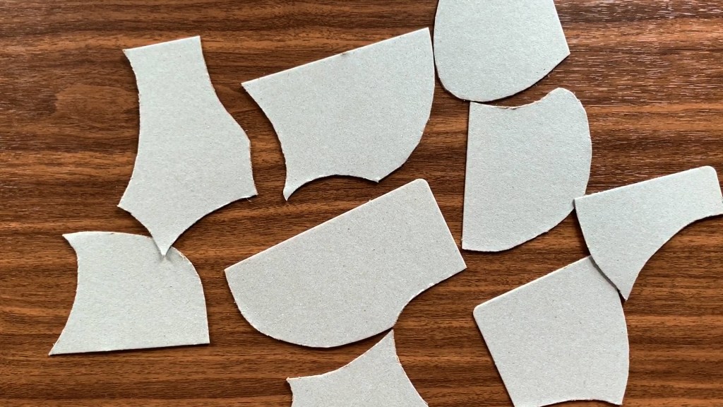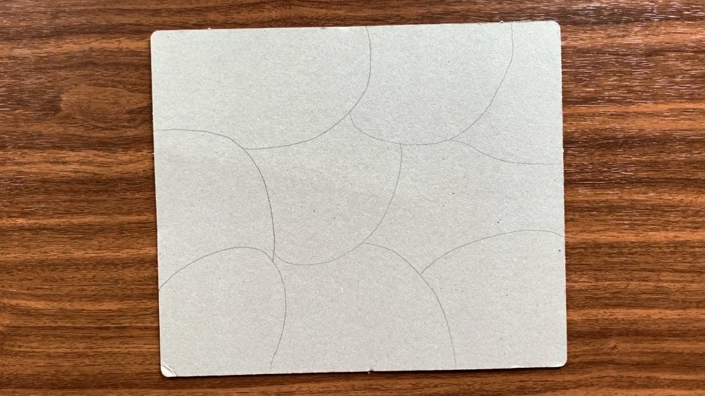 First, cut your cardboard into a big square or a rectangle. Then draw curved lines with a pencil to divide the large rectangle into several shapes. These shapes are going to be the faces. Make your own faces in different shapes, sizes and numbers.