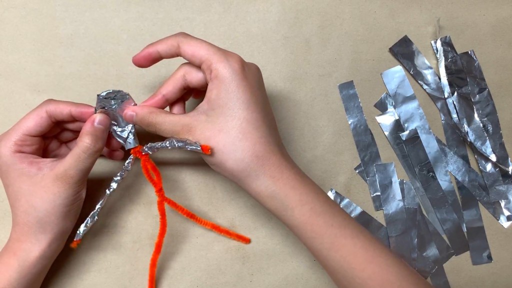 Now let’s add volume to the skeleton! Take a sheet of aluminum foil and cut it into thin and long pieces with scissors to make it easy to cover the pipe cleaner.