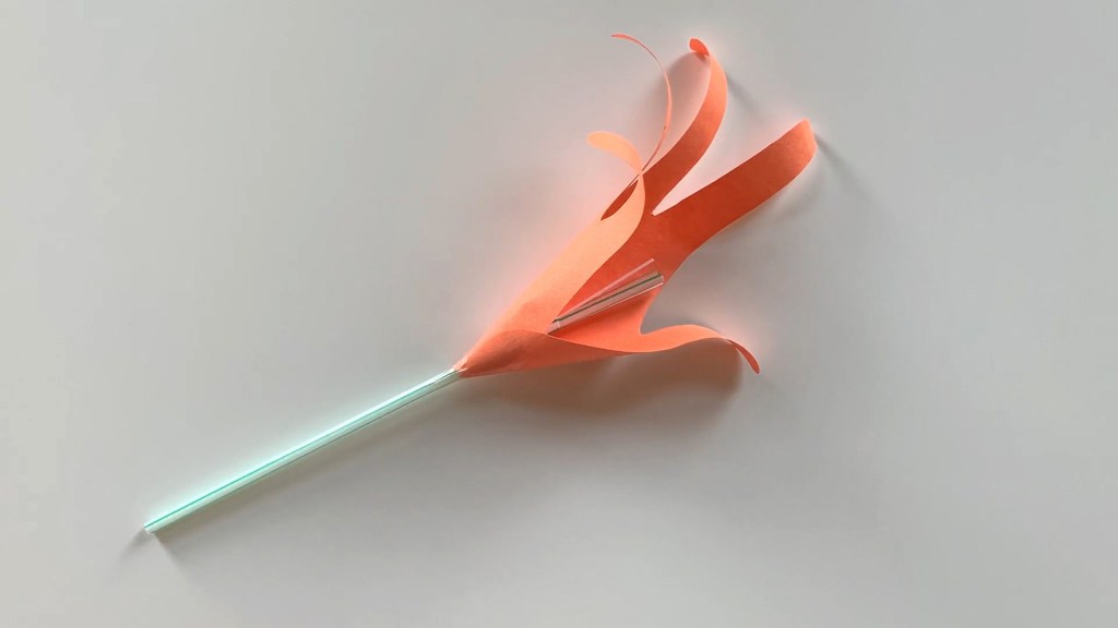 Handprint Flower The Supplies You Will Need pencil / scissors / straws / adhesive tape / construction paper Let’s Make A Handprint Flower! First, trace the outline of your hand with a pencil onto a piece of construction paper. Then cut out the handprint with scissors. Roll the bottom of the hand shape into a cone-like shape. Leave a small hole at the end of the cone for the straw to go through. Tape it to hold them together. Using the side of the pencil, curl the paper fingers outward one by one to form a petal shape. A round pencil is perfect for it. Look! The handprint turns into a flower. Now, let’s make the stem of the flower! Take a straw. Cut the end of the straw into several parts with scissors to make it look a stamen shape. Then insert the bottom of the straw into the hole of the paper flower and pass it through. Position the stamen part of the straw so it can be seen properly. Tape them to hold it together. Great! Make as many as you want. Tie them together with a ribbon to make a bouquet. Wouldn’t it be nice to give to someone as a present? Watch The Video Tutorial Here! Share this: Click to share on Pinterest (Opens in new window) Pinterest