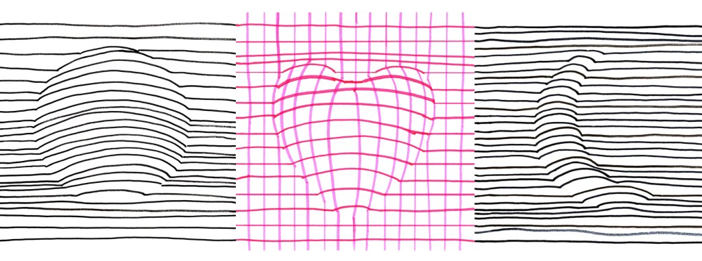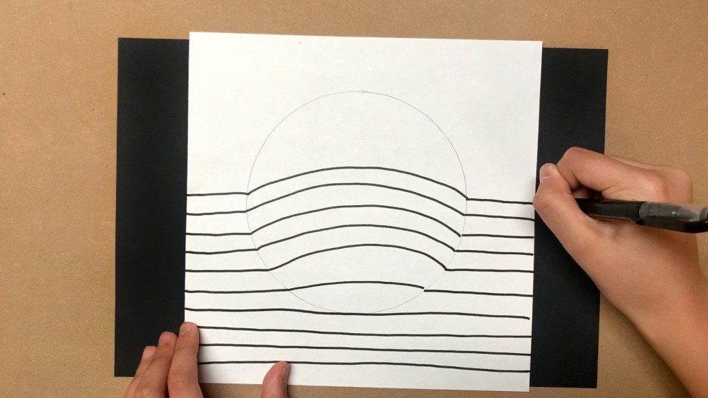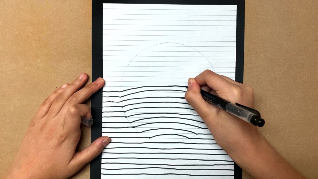 Draw a straight line with a marker until you get to the pencil line. Then draw a curved line from a pencil line to the other line. And continue making a straight line.