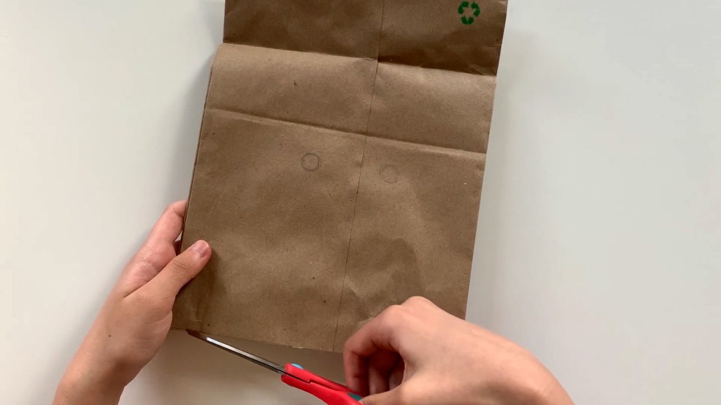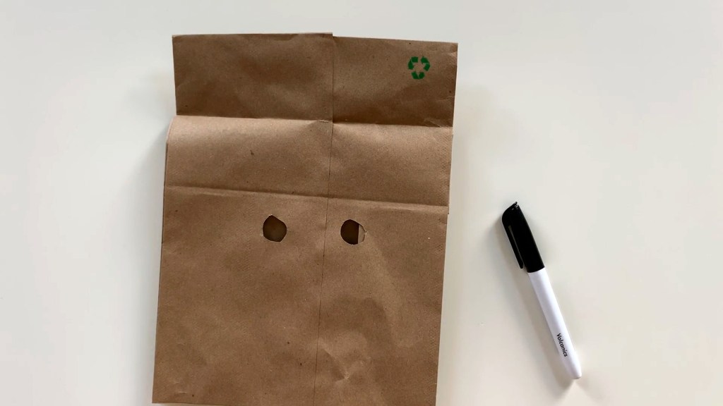 Put the paper bag over your face and mark your eyes on the bag. Then cut out the two holes. Make sure it is big enough.