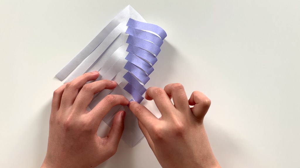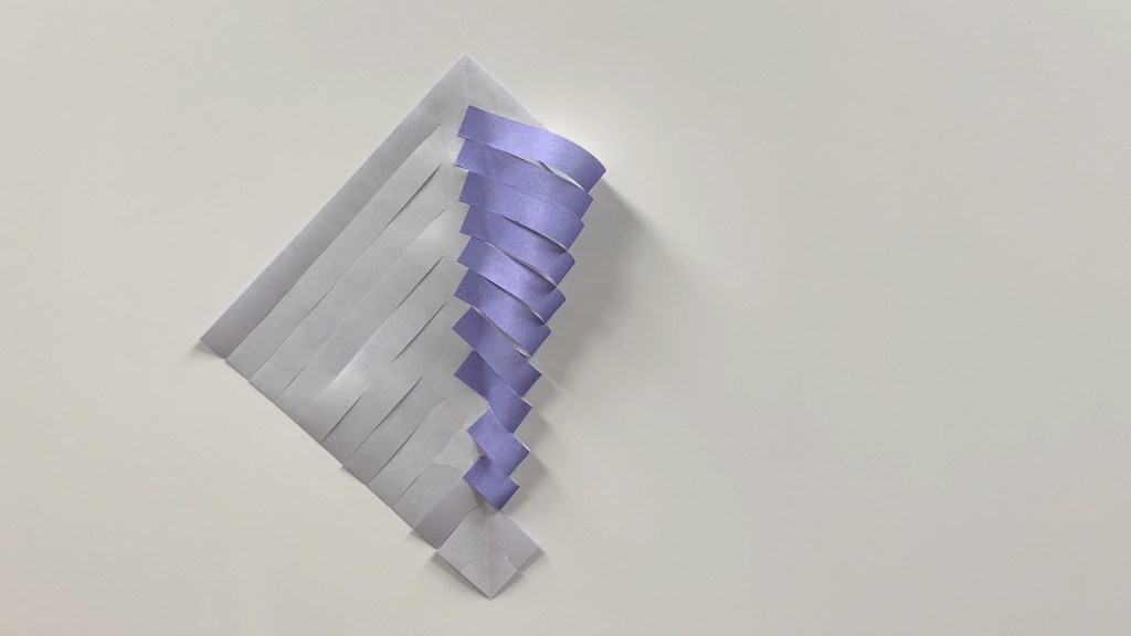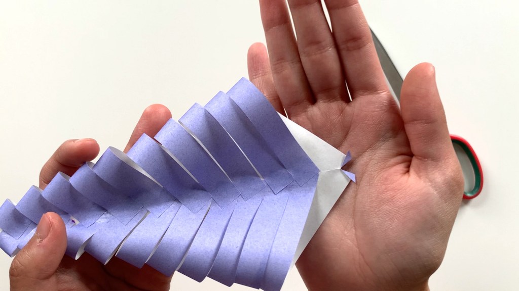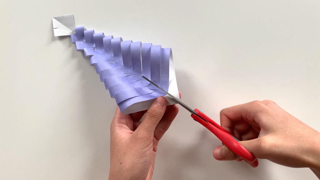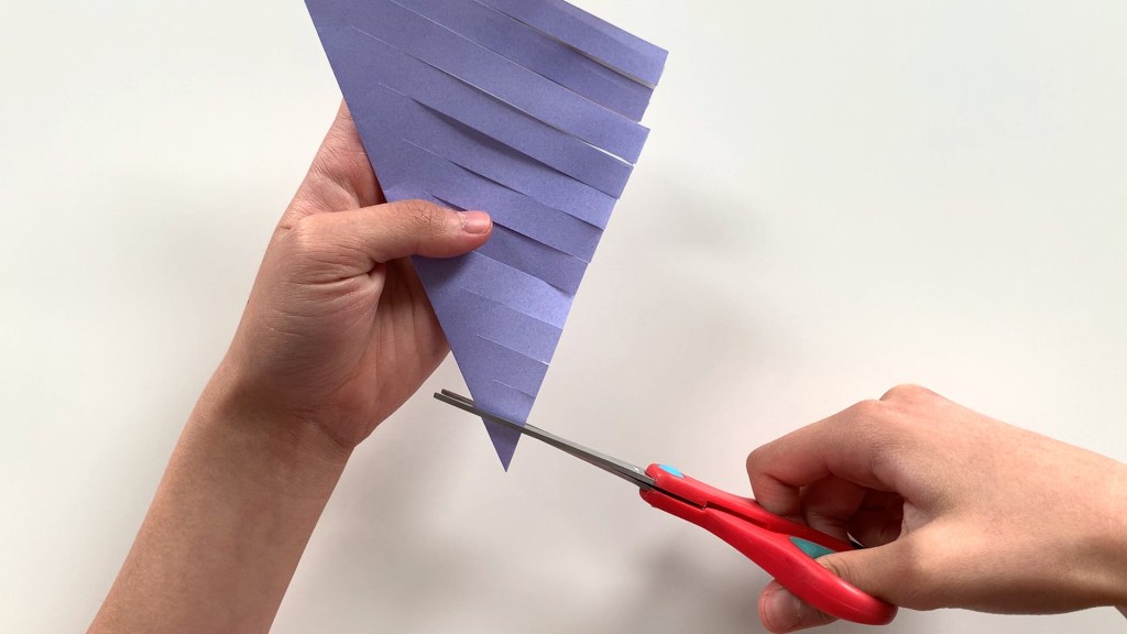 Cut the one open side of the paper folded in the shape of a triangle at equal intervals with scissors. Cut from the outside to the inside, leaving a small crease in the middle.