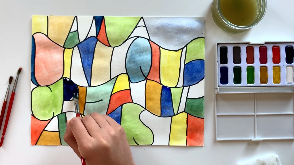 Next, paint all the empty shapes with watercolors. Try to make it colorful using bright colors to show the black letters as well.