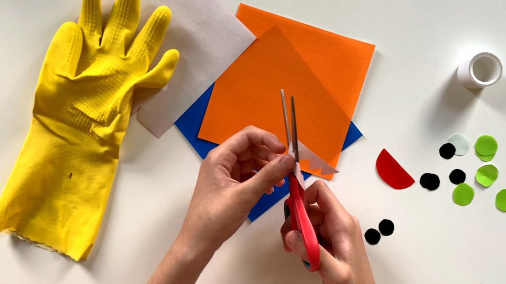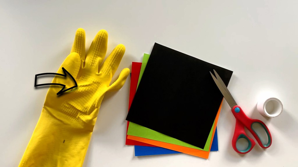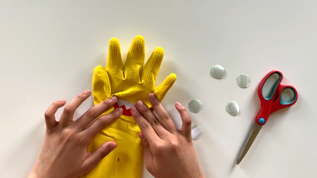 recycled rubber glove / scissors / glue or double-sided adhesive tape / some decorating materials like colored paper and yarn