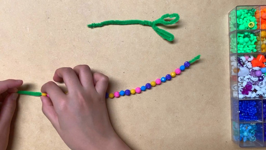 Take the other pipe cleaner and put the beads through it. Let’s make colorful patterns!