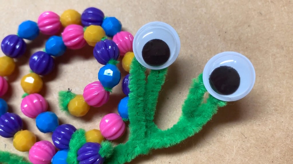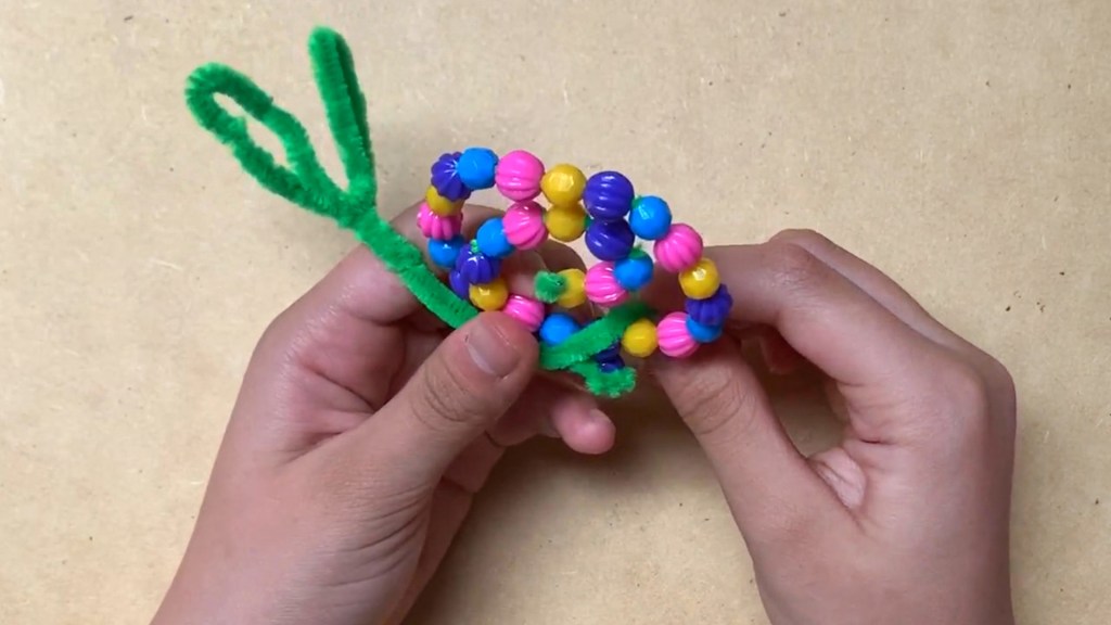 Rolled pipe cleaners can easily stretch out because they are weak. So hold the two strings together so that they won’t stretch out. And then secure them by winding them twice with the pipe cleaner that you’ve made for the eyes. Tighten the pipe cleaner between the beads.