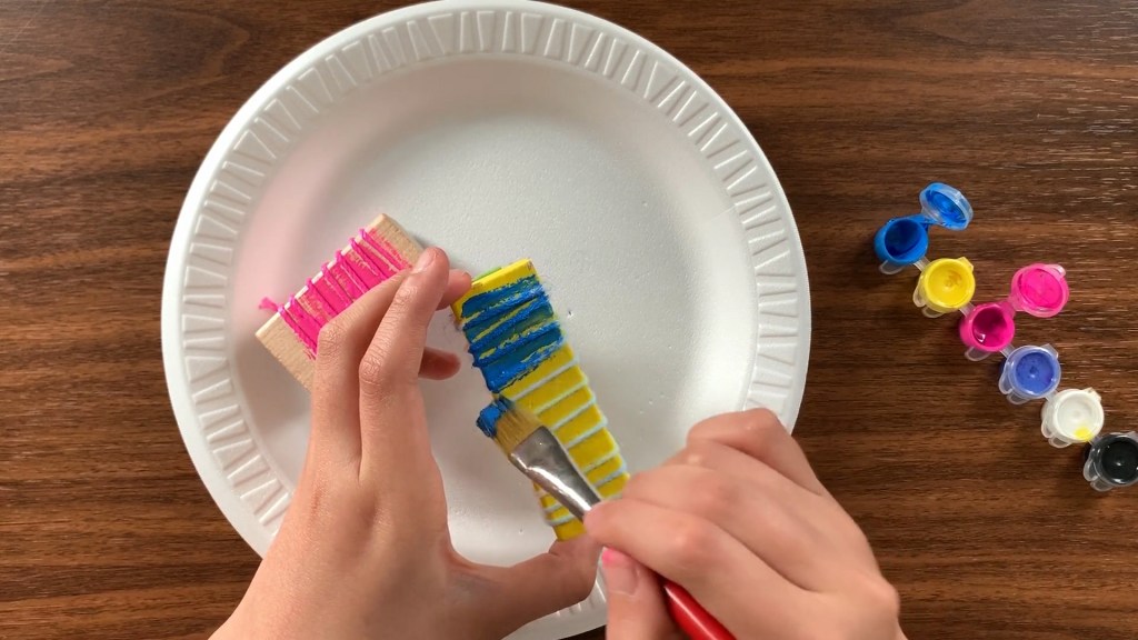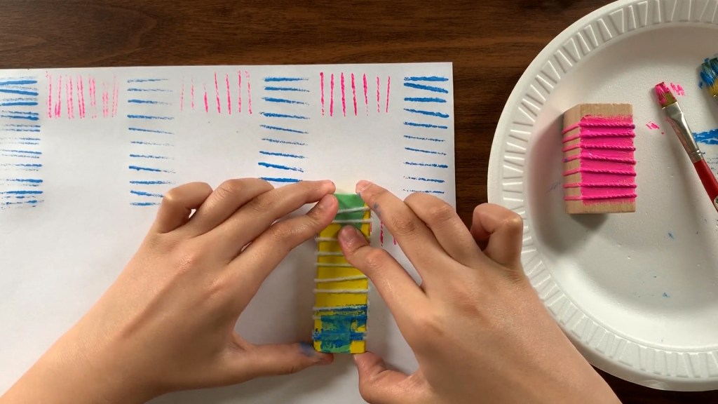 white paper / wooden blocks / yarn or rubber bands / paint / paintbrushes / tape